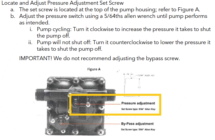 If your water pump shuttering / vibrating / continuing to run there is a pressure adjustment on the underside of the pump via Allen wrench. Too little pressure the pump continues to run or shutter trying to shut off. It just needs to be adjusted 1/4 turn clockwise: